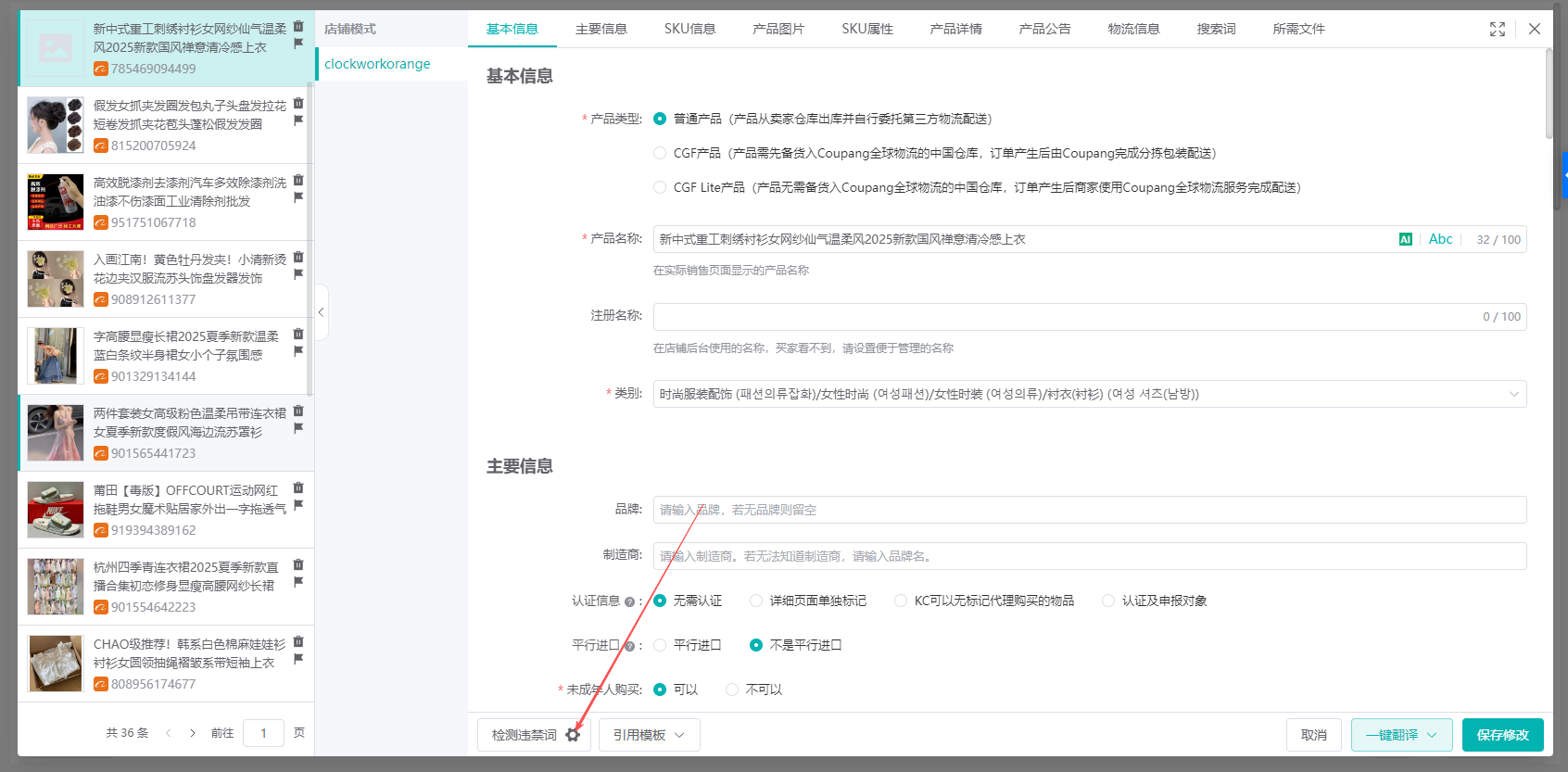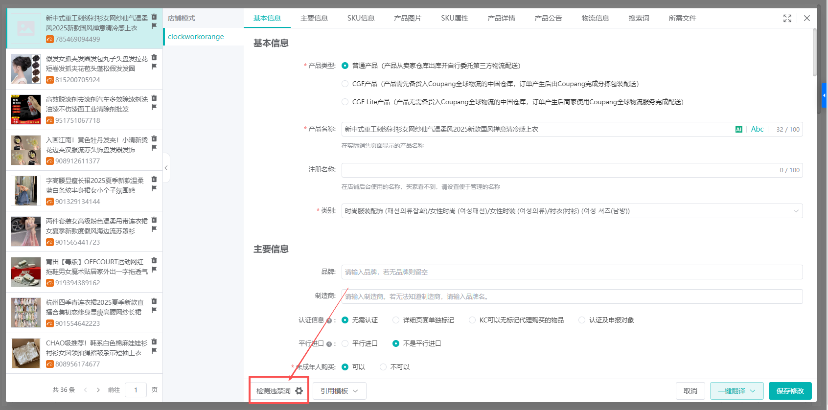 (6)点击界面右下方【检测违禁词】功能,妙手ERP会自动检测产品标题、描述和SKU名称中是否含有的违禁词