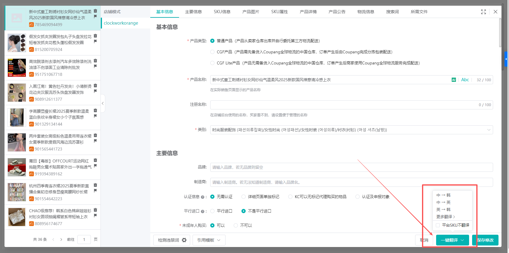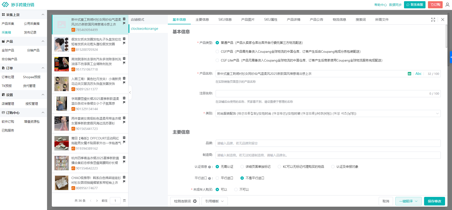 在此弹窗中编辑基本信息、类目属性、SKU信息、产品图片等,带红色*的选项为必填项