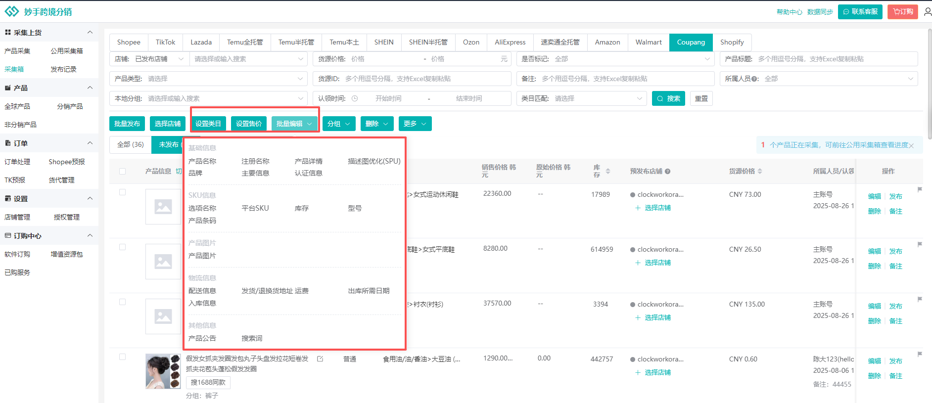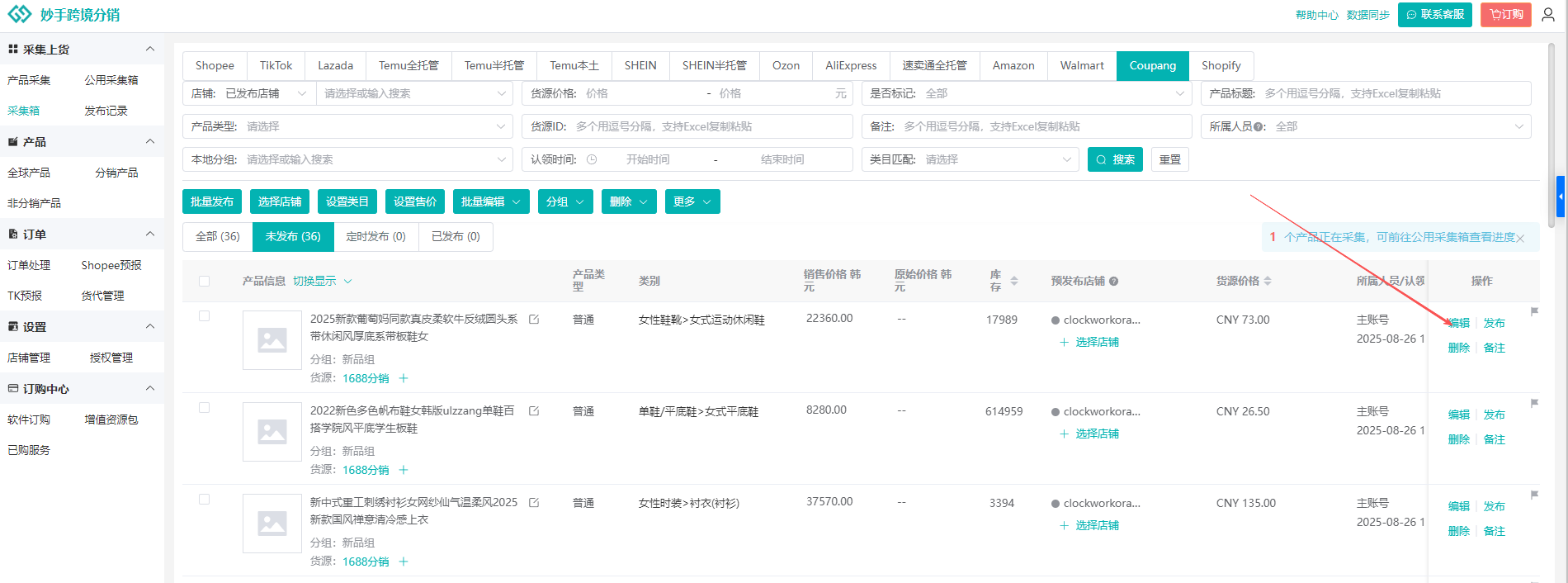 采集1688产品到妙手轻应用,并在公用采集箱中认领产品到Coupang采集箱,具体操作流程可跳转查看:1688妙手跨境分销采集刊登教程