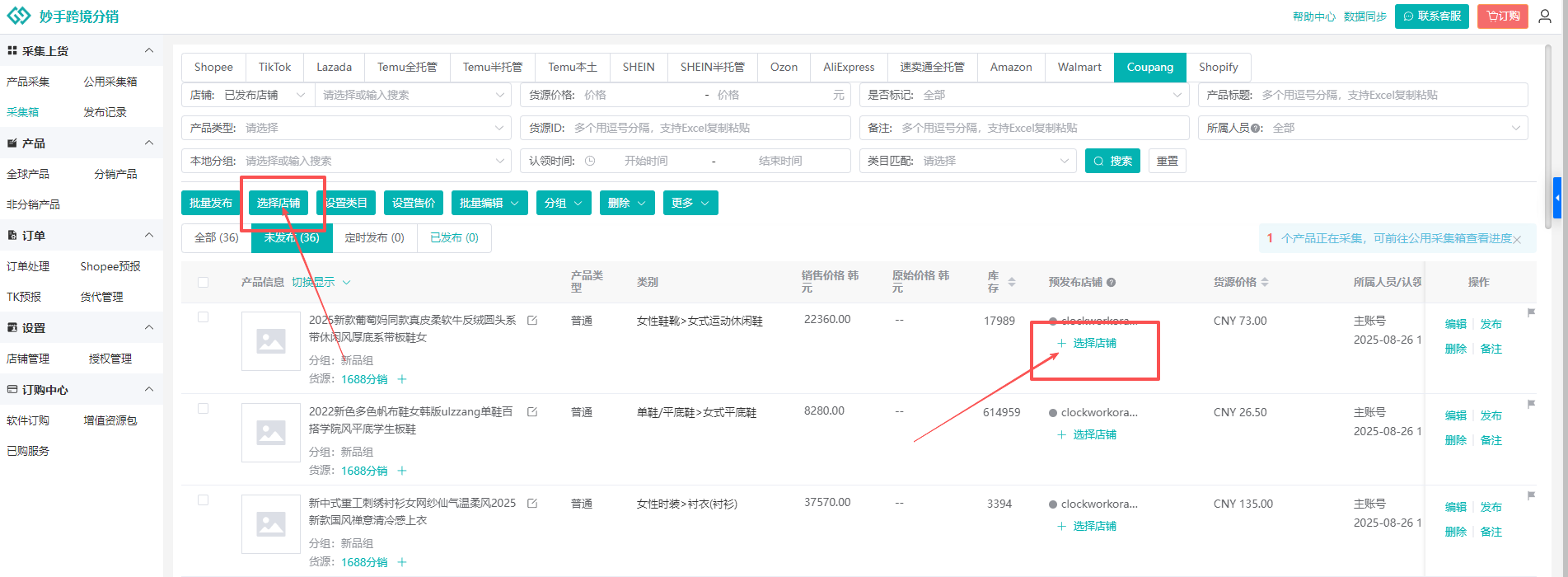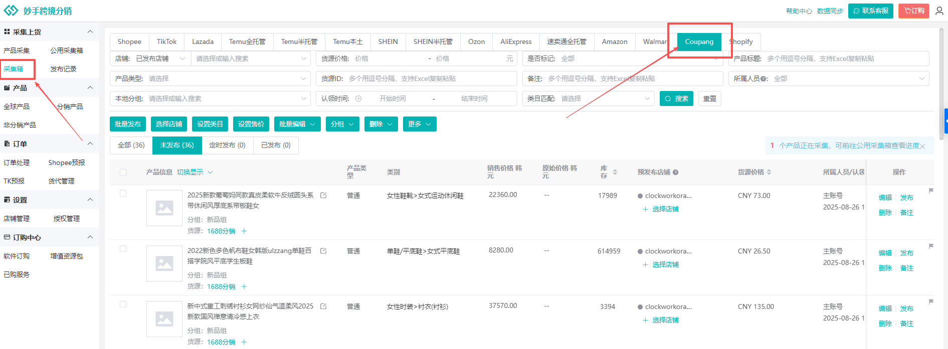 (1)产品认领到Coupang后,进入采集箱=>Coupang