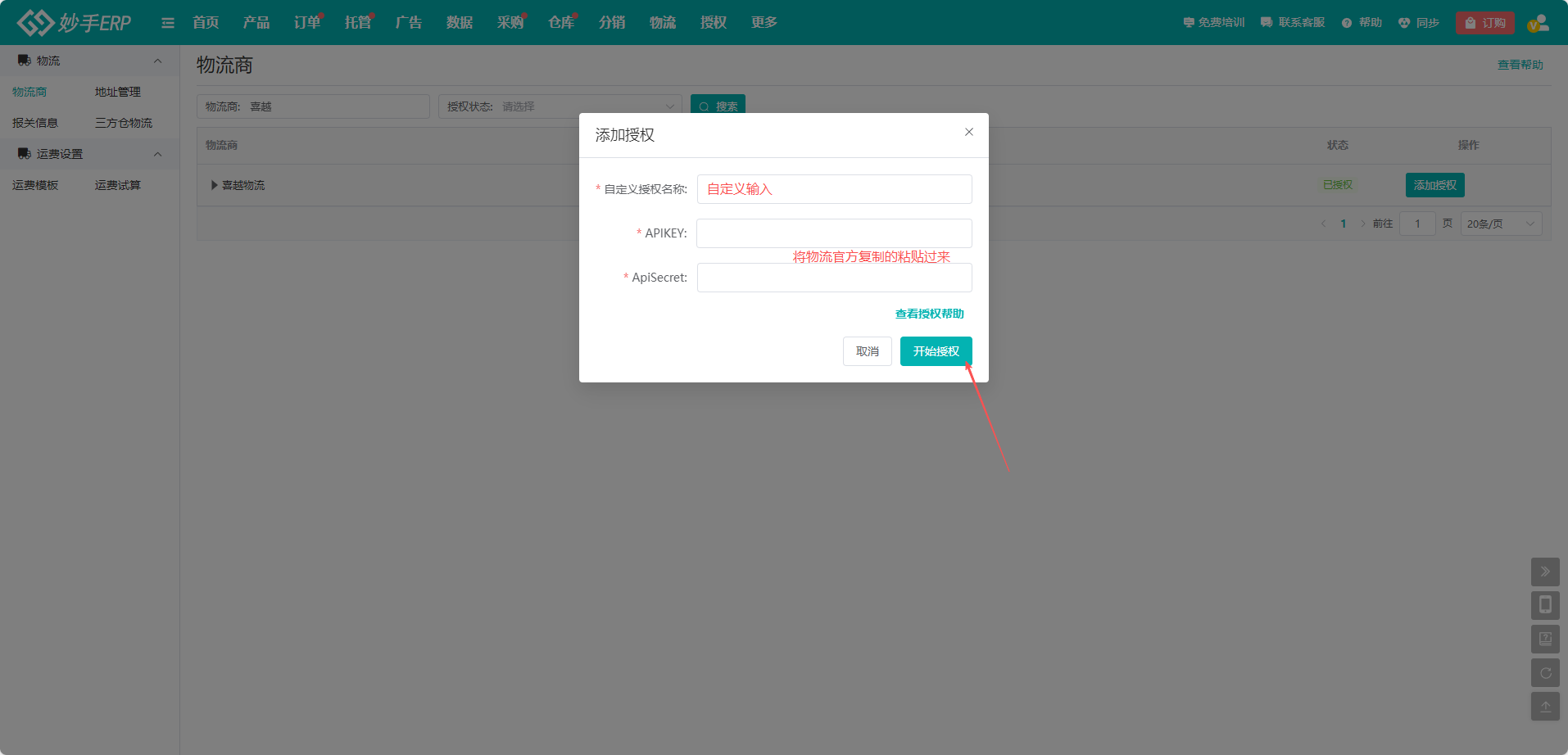 (2)在弹窗中,自定义输入授权名称,APIKEY和APISecret需要联系物流商工作人员获取,点击【开始授权】