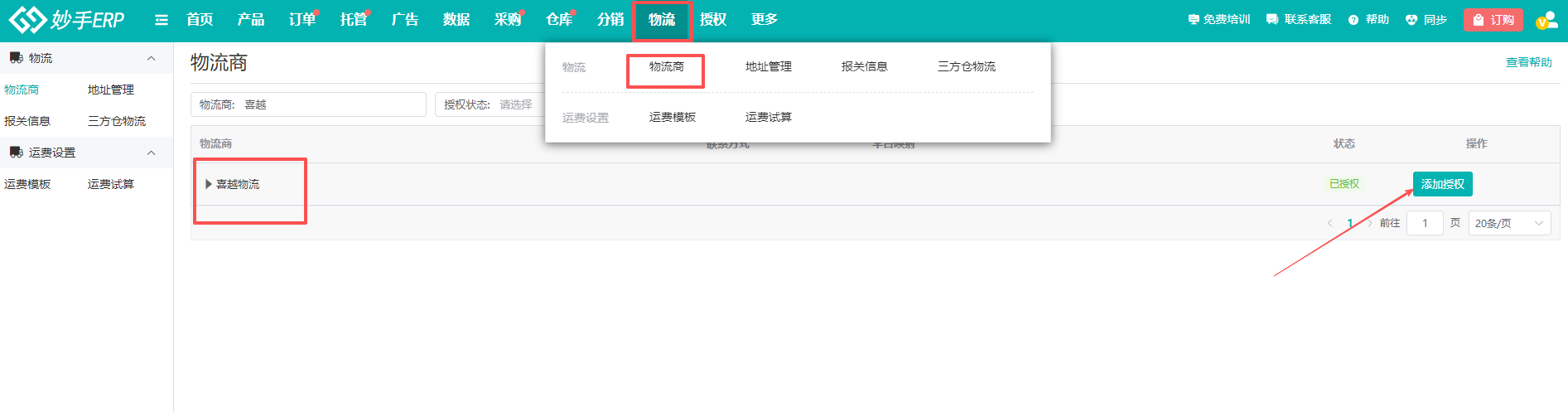(1)进入妙手ERP,选择物流=>物流商=>找到喜越物流,点击【添加授权】