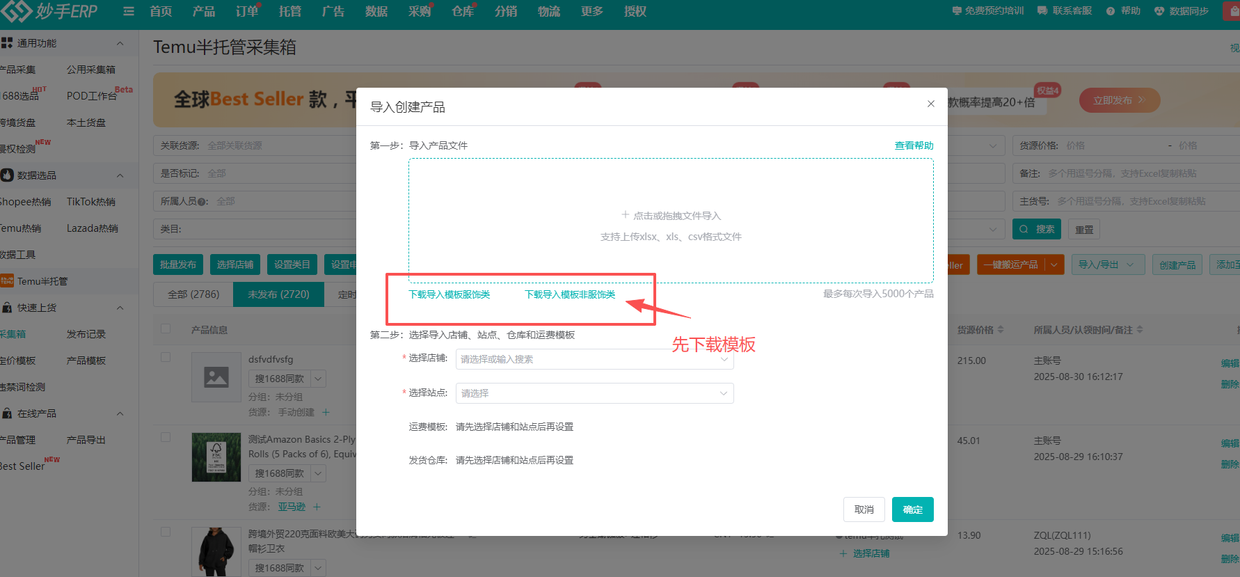 1、Temu半托管目前支持批量导入产品到采集箱,下载模板到本地后,在模板中录入需要上传的产品信息后,即可上传到妙手ERP