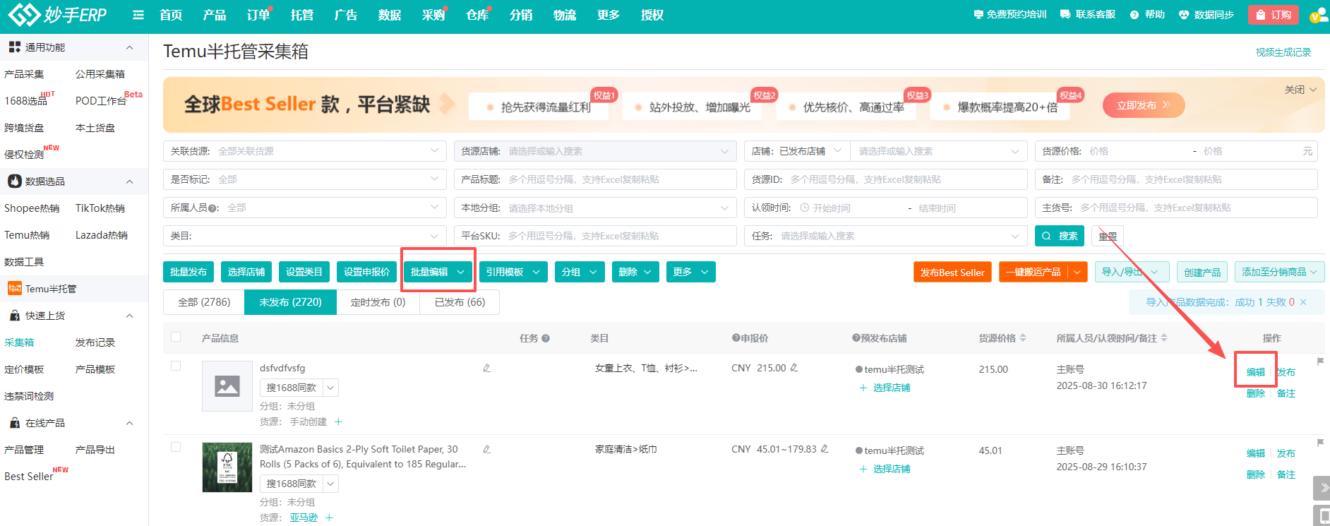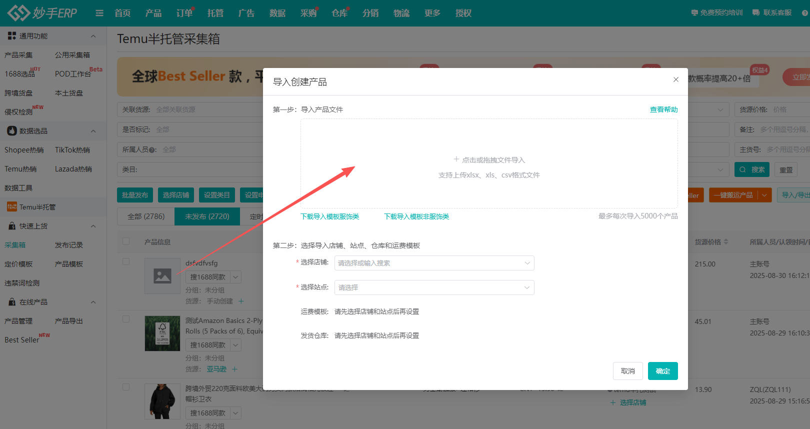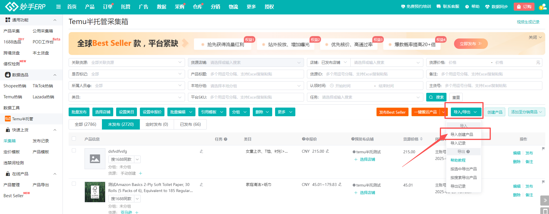 2、本教程讲解如何使用妙手ERP完成Temu半托管店铺批量导入产品的操作流程;