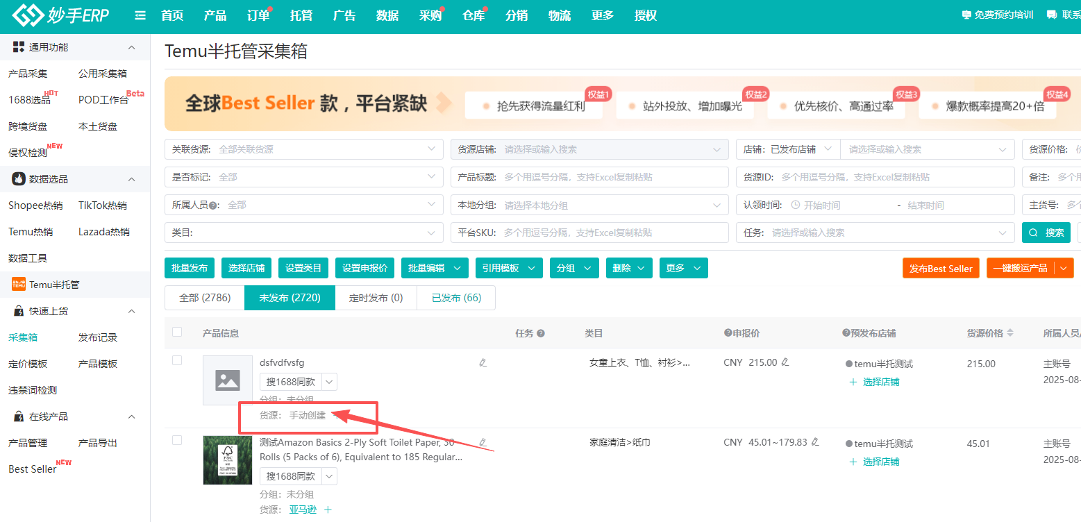 (10)显示导入成功后,刷新一下页面可以查看到导入的产品,来源显示为:手动创建