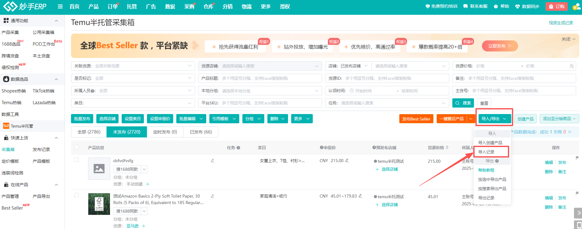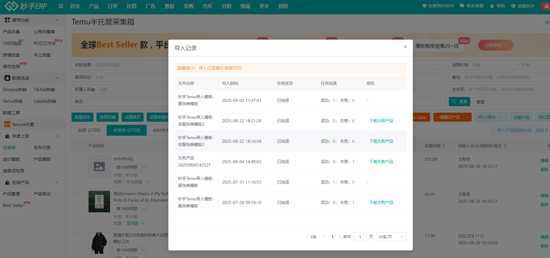 (1)点击导入=>导入记录,若产品导入失败,支持下载查看失败产品,导入记录保存90天