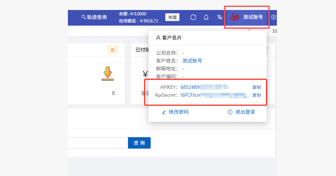 (1)登入位像素物流官网,右上角点击账号名称=>在客户名片中,复制APIKEY和APISecret到妙手ERP,具体位置可查看下图框选区域