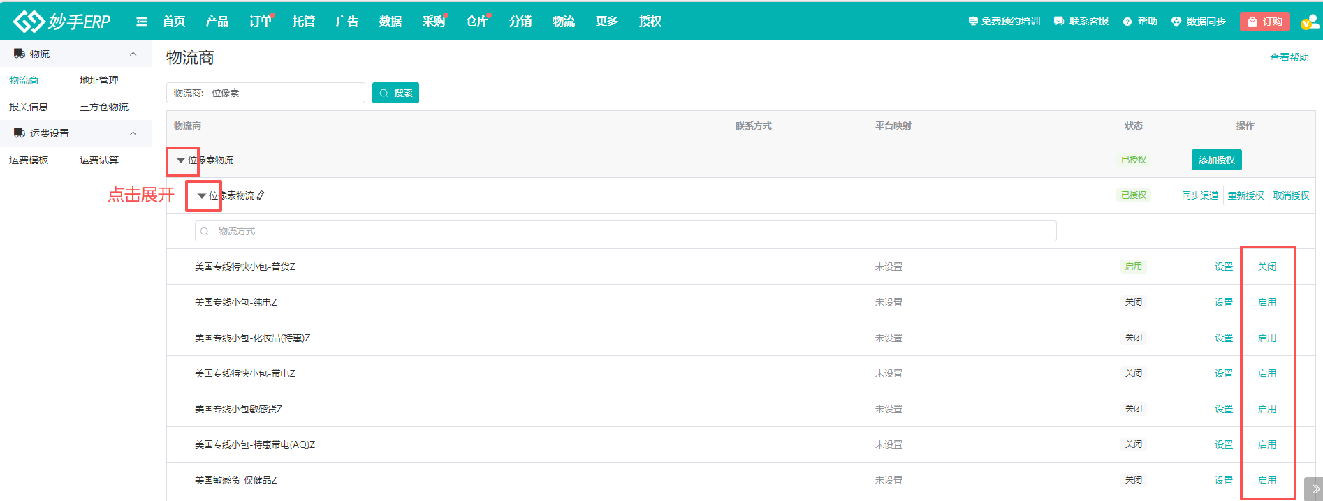 (5)授权后,点击三角标展开,选择需要启用的物流渠道,点击启用
