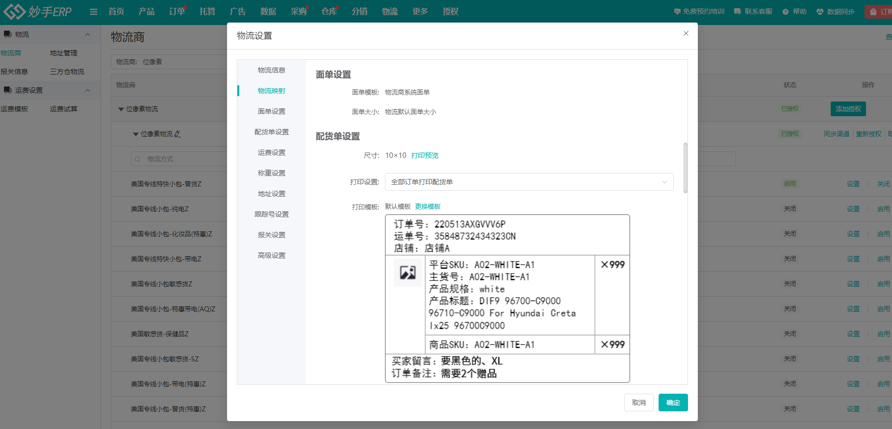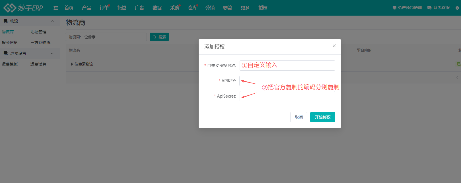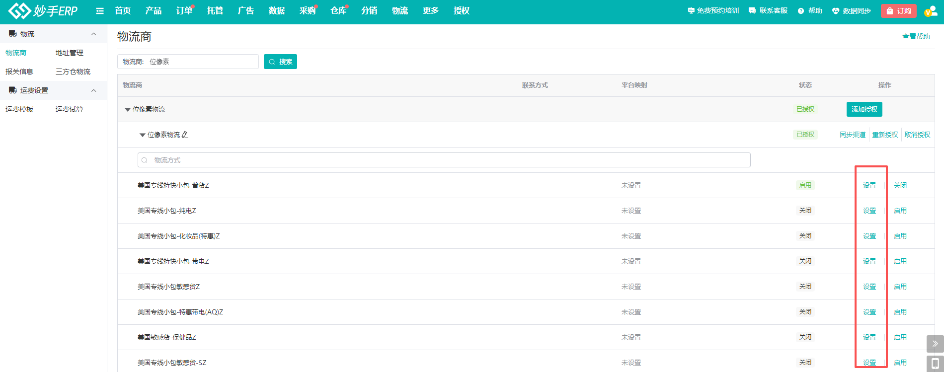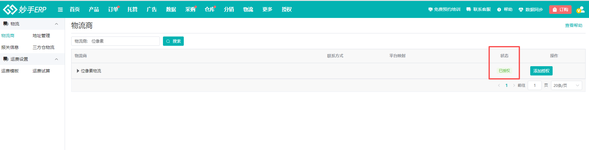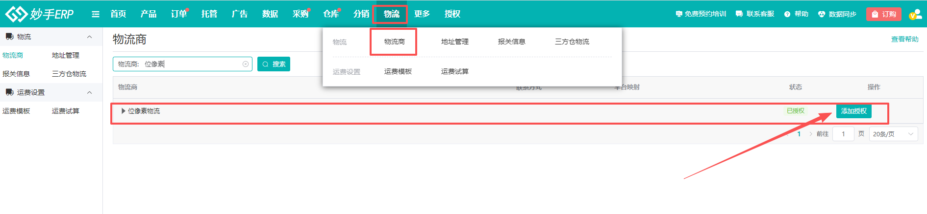 (2)进入妙手ERP,选择物流=>物流商=>找到位像素物流,点击【添加授权】