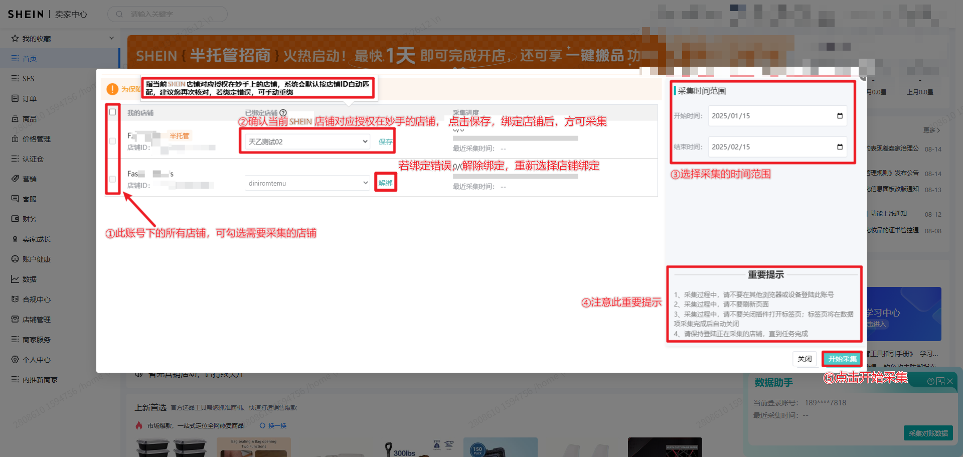 3、勾选要采集的店铺=>确认已绑定的店铺,点击保存=>选择要采集的时间范围=>点击【开始采集】按钮,等待完成即可;